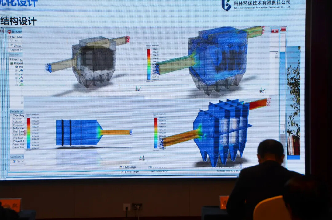 技术分享环节亮点纷呈。苟登军副总向与会嘉宾详细汇报了科林技术在固废焚烧、热电锅炉、建材化工、钢铁冶金、粮食轻工等多个领域的应用情况,重点介绍了公司在各细分领域所取得的技术突破、市场占有率优势,并展示了公司的标志性示范工程。沈卫星总助兼总工在《颗粒物超低排放背景下的精品袋式除尘器》报告中,系统阐述了超低排放与PM2.5捕集的技术路径,提出需从技术创新、制造工艺、安装调试及运维管理四大维度实施精细化管控。秦奕鹰研发总监则揭开了“高效研发设计平台”的神秘面纱,该平台集成系统设计模块与研发常用设计计算程序,使研发周期缩短30%。现场通过沉浸式三维动态推演,直观展现除尘器流场分布优化与滤袋脉冲清灰协同机制。如今,科林的研发平台全面拓展数字仿真技术应用领域,推动设计从信息化向智能化迈进。